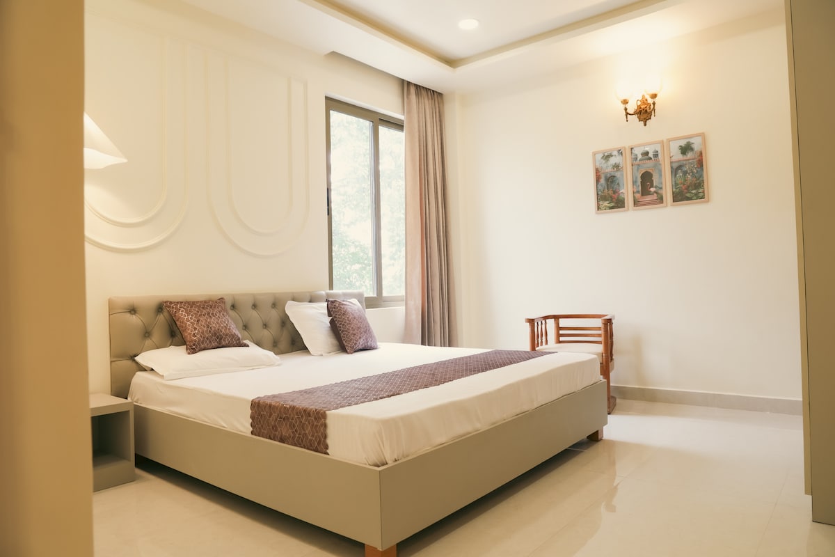 Get a step closer to nature, comfort and convenience at our charming Bluebell cottage! 10 minutes from Airport, 20 mins from Charbagh railway station, right behind the renowned Lulu Mall, stone throw away from the Palassio Mall, a mere 500 meters from Medanta Hospital, our cottage is strategically positioned for an unparalleled stay. Located in the heart of Sushant Golf City, it serves as the ideal hub for your visit to Lucknow! Along with a king bed, you get two additional folding beds.