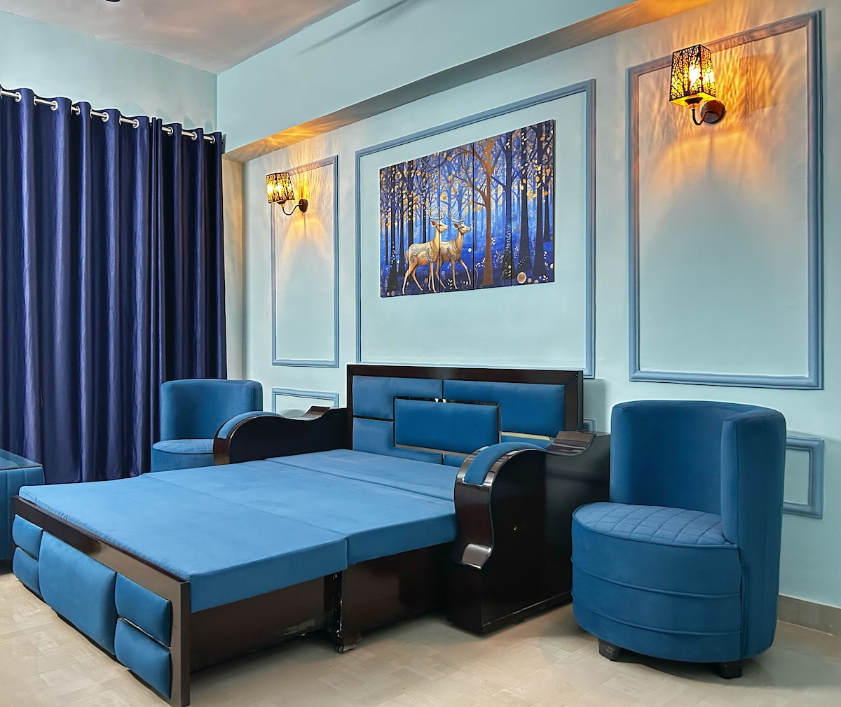 Get a step closer to nature, comfort and convenience at our charming Bluebell cottage! 10 minutes from Airport, 20 mins from Charbagh railway station, right behind the renowned Lulu Mall, stone throw away from the Palassio Mall, a mere 500 meters from Medanta Hospital, our cottage is strategically positioned for an unparalleled stay. Located in the heart of Sushant Golf City, it serves as the ideal hub for your visit to Lucknow! Along with a king bed, you get two additional folding beds.