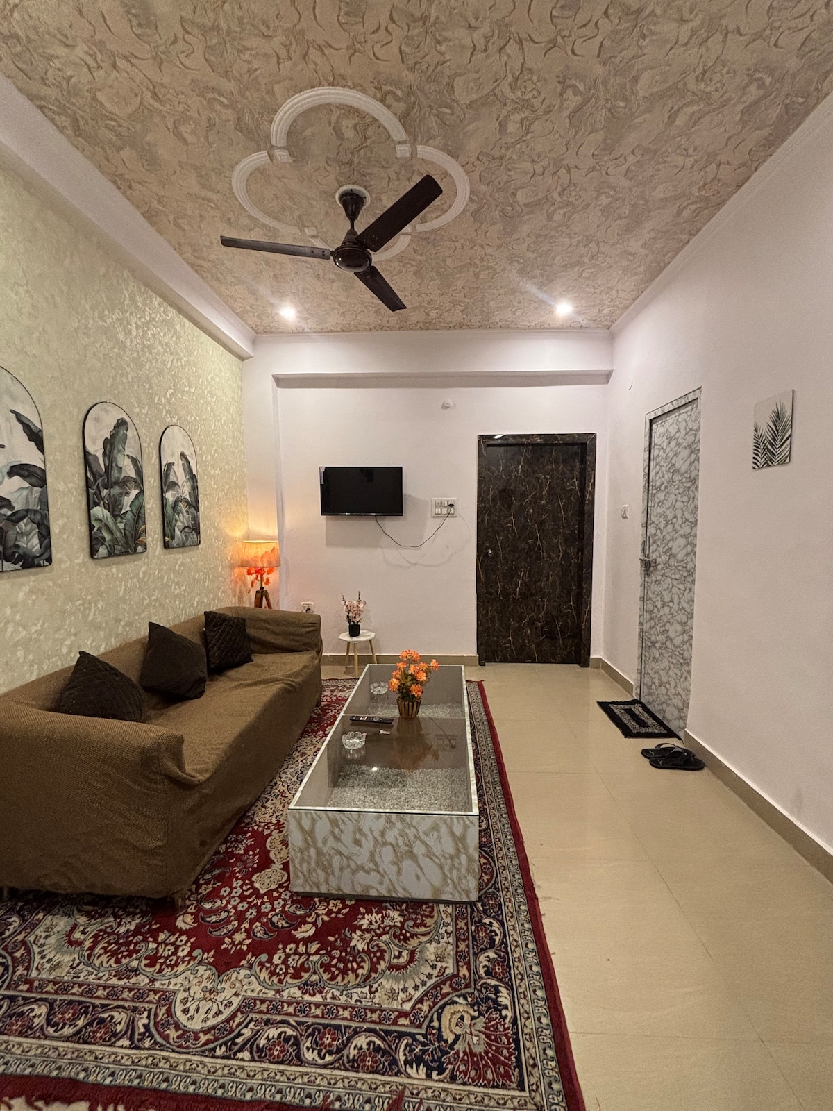 Step into a bright 1 BHK flat with a stylish living room featuring a marbled ceiling, sleek fan, and soft lighting. Red velvet chairs and a dark marble table offer cozy seating, while navy and cream curtains bring in natural light. Enjoy a smart TV setup, elegant décor, and a fully equipped kitchen for convenient cooking. The connected bedroom adds comfort, making this modern space ideal for both work and leisure stays.