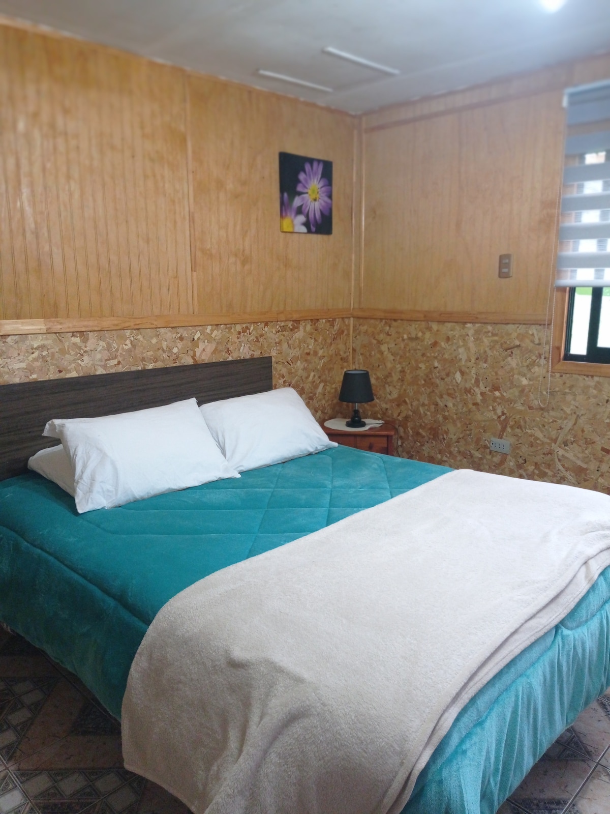 Hermosa cabaña -Martín Pescador- de madera tejuela de 55 mts2 con 2 habitaciones, una con cama matrimonial de 2 plazas y otra con cama plaza y media más cama nido de una plaza. Calefacción con radiador eléctrico y adicional calefacción a Pellet central. Amplio baño con lavadora incluida. Cocina equipada y Frigobar. Excelente construcción con aislación térmica, piso de madera y todos los ventanales en Termopanel. Opción de un excelente desayuno por $7.500 pesos chilenos p/p.