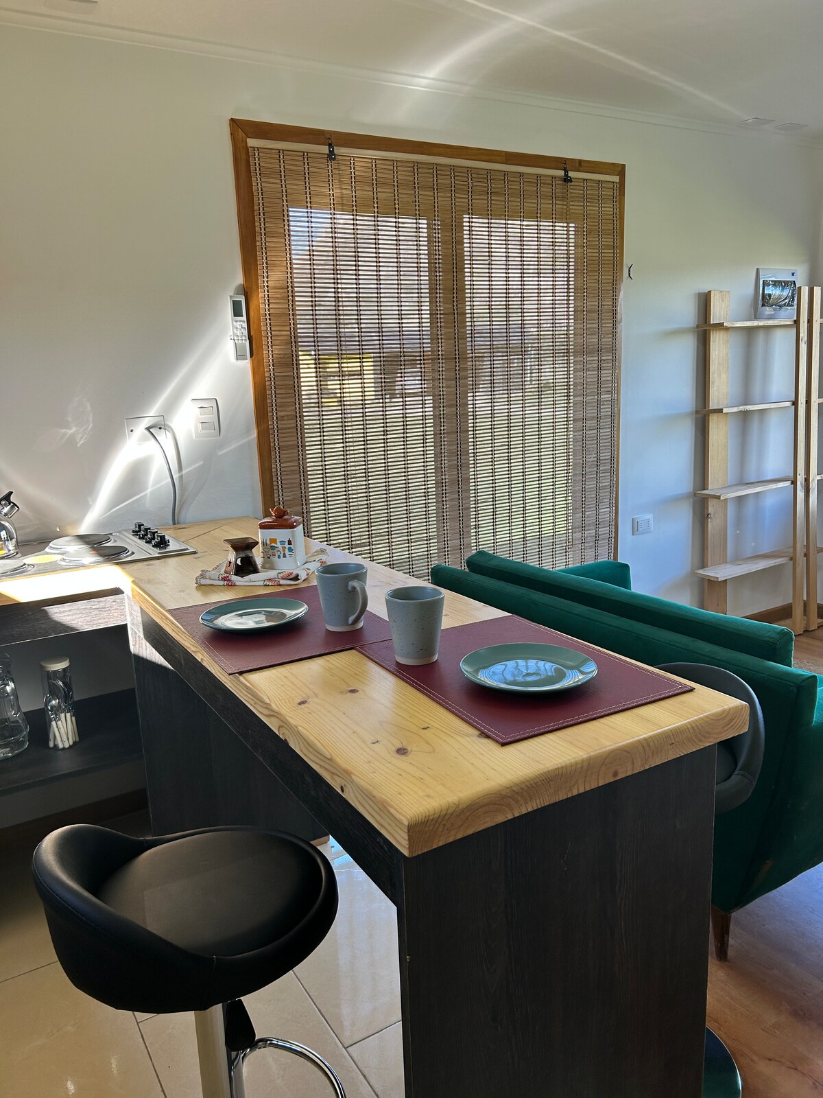 Departamento mono ambiente para tres personas a pasos del lago. Contamos con equipamiento y disposición para utilizar kayaks para brindar una experiencia divertida en Puerto Guadal. Incluye por departamento WIFI, Smart TV. No cuenta con cocina a gas solo con horno eléctrico, Frigobar, Combustión lenta, un amplio baño moderno y camas confortables. Comedor con mesa redonda y cuatro sillas. Los esperamos para brindarles un cálido recibimiento en Kau-Yenú.