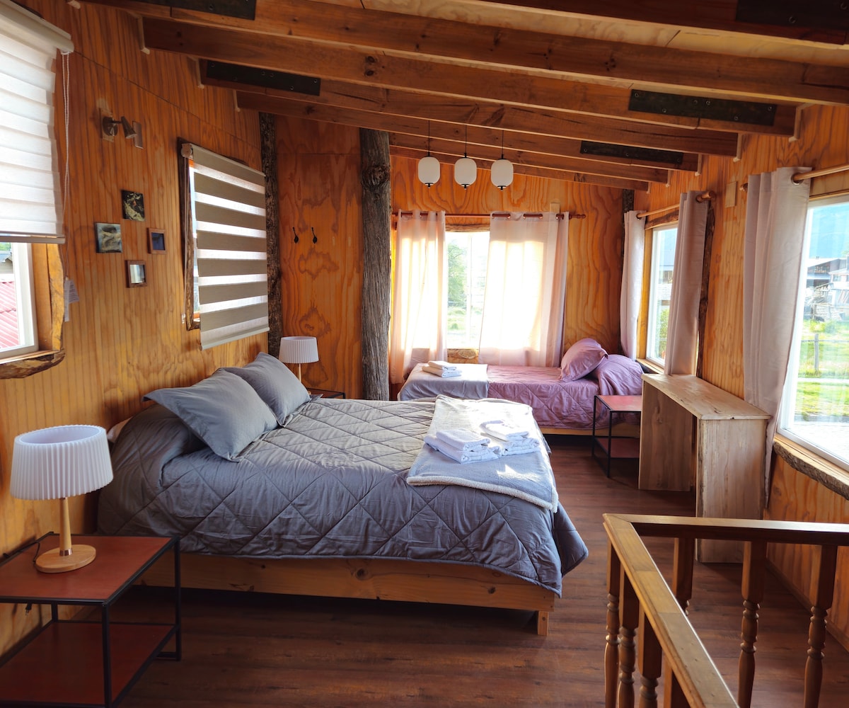 Cabin 500 meters from Villa Cerro Castillo, at the foot of the National Park and steps away from the trekking trail to the Laguna, Rio Ibañez, climbing routes, bike trails, and horseback riding. 1 bedroom on the first floor and another on the second floor, 1 bathroom, living room with integrated small kitchen. Accommodates 2 people (max 4). Breathtaking views of Cerro Castillo with a border along the Estero del Bosque. Ideal for 2 people who want to enjoy nature and outdoor activities.