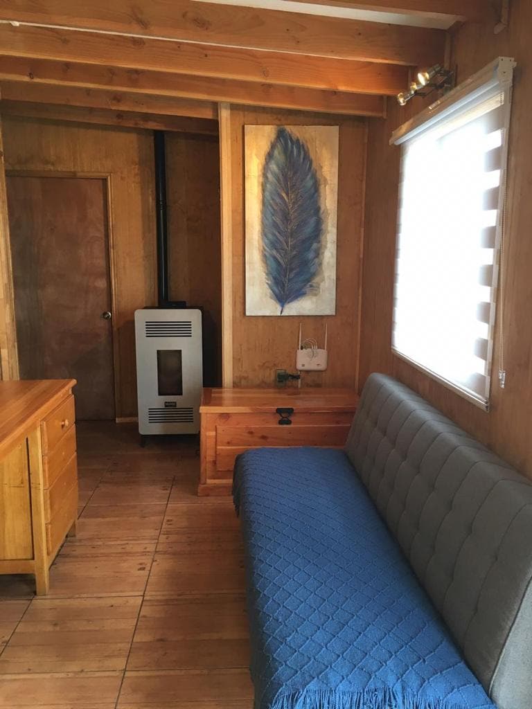 Cabaña completamente equipada, donde contamos con microondas, horno, todo tipo de utensilios de cocina, wifi, smart tv, calefacción eléctrica, parrilla a carbón, 1 habitación con cama de 2 plazas, y en el living se encuentra una cama de 1 plaza, más un sofa cama de 2 plazas. Además contamos con el servicio de tinaja para 6p con agua caliente que está contemplado en el valor total. Ven y disfruta de los sonidos de la naturaleza, cuando te quedes en este lugar único e inigualable.