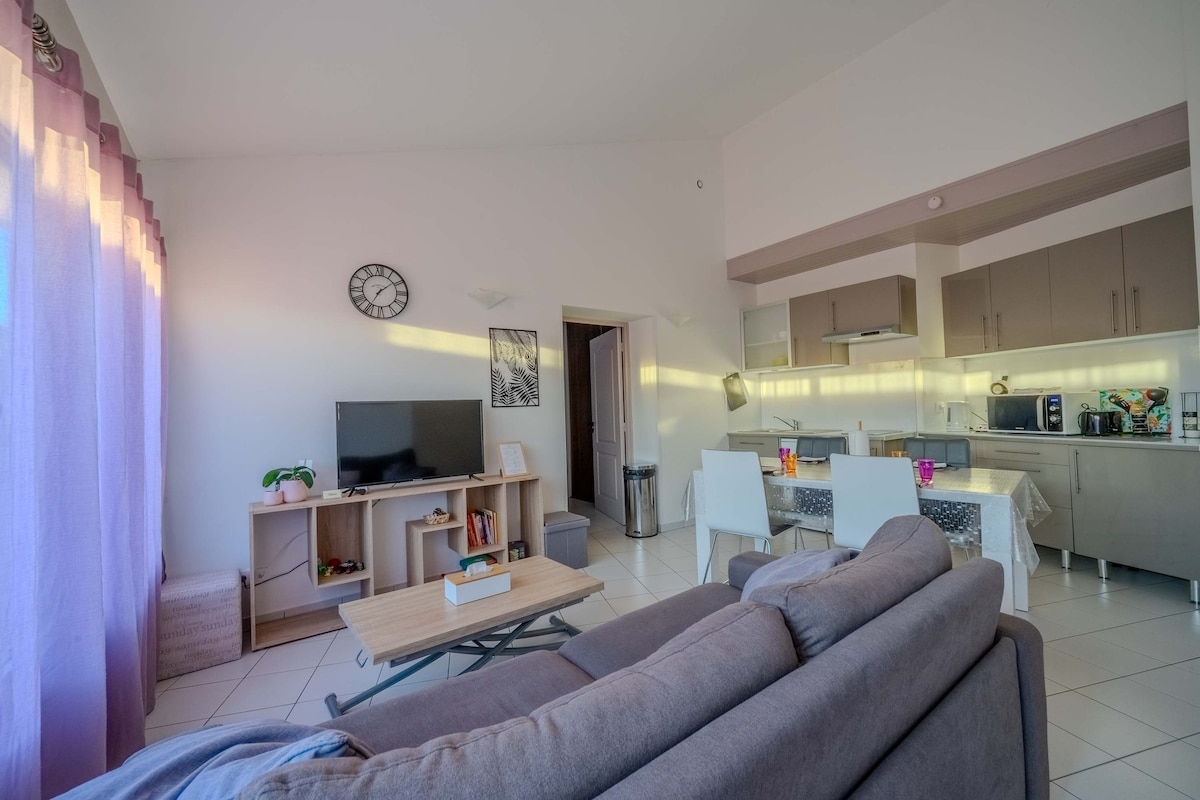 This charming ground-floor apartment is located in a very quiet neighborhood, just 300 meters from the beach. A single road will take you directly to the heart of La Rochelle (3 minutes by car). The apartment includes a living room with a lounge/sleeping area and a dining space, a fully equipped kitchen (stovetop, microwave, fridge, espresso machine), and a bathroom. A free private parking space is available for your convenience.