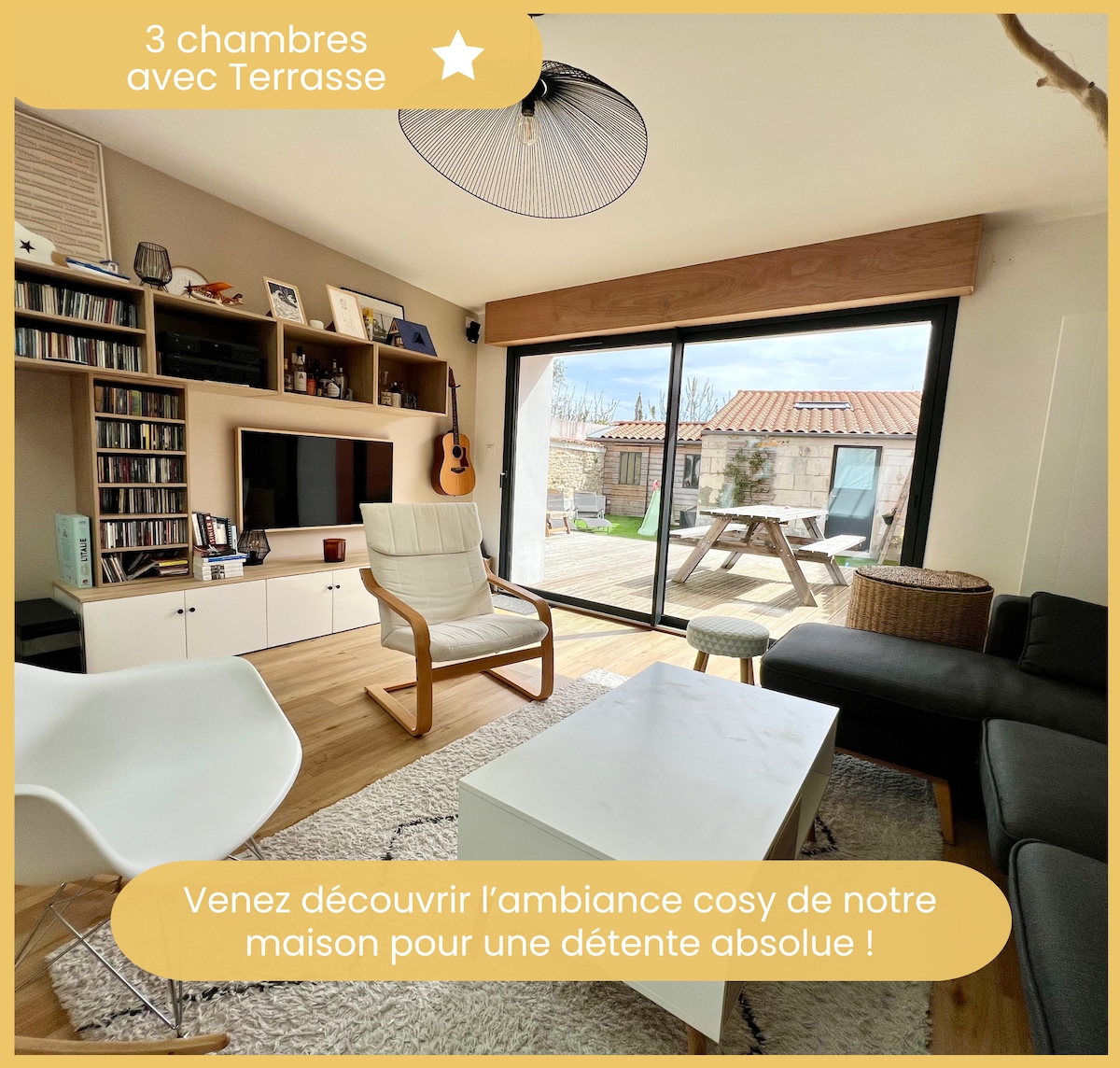 Meublé de tourisme classé 3 étoiles Maison spacieuse 4km Chatelaillon-Plage et ses commerces Grande terrasse, grand préau, terrain 800m2 entièrement clos sans vis à vis Grande pièce de vie-cuisine ouverte très bien équipée. 3 chambres + 1 couchage sur mezzanine (4 lits en 140) , grande salle de bain douche à l'italienne/double vasque. 1 wc séparé. 10 mn La Rochelle, idéal pour visiter Fort Boyard, les iles, ... Salon de jardin, 6 vélos , table Ping -pong, barbecue Possibilité location linge.