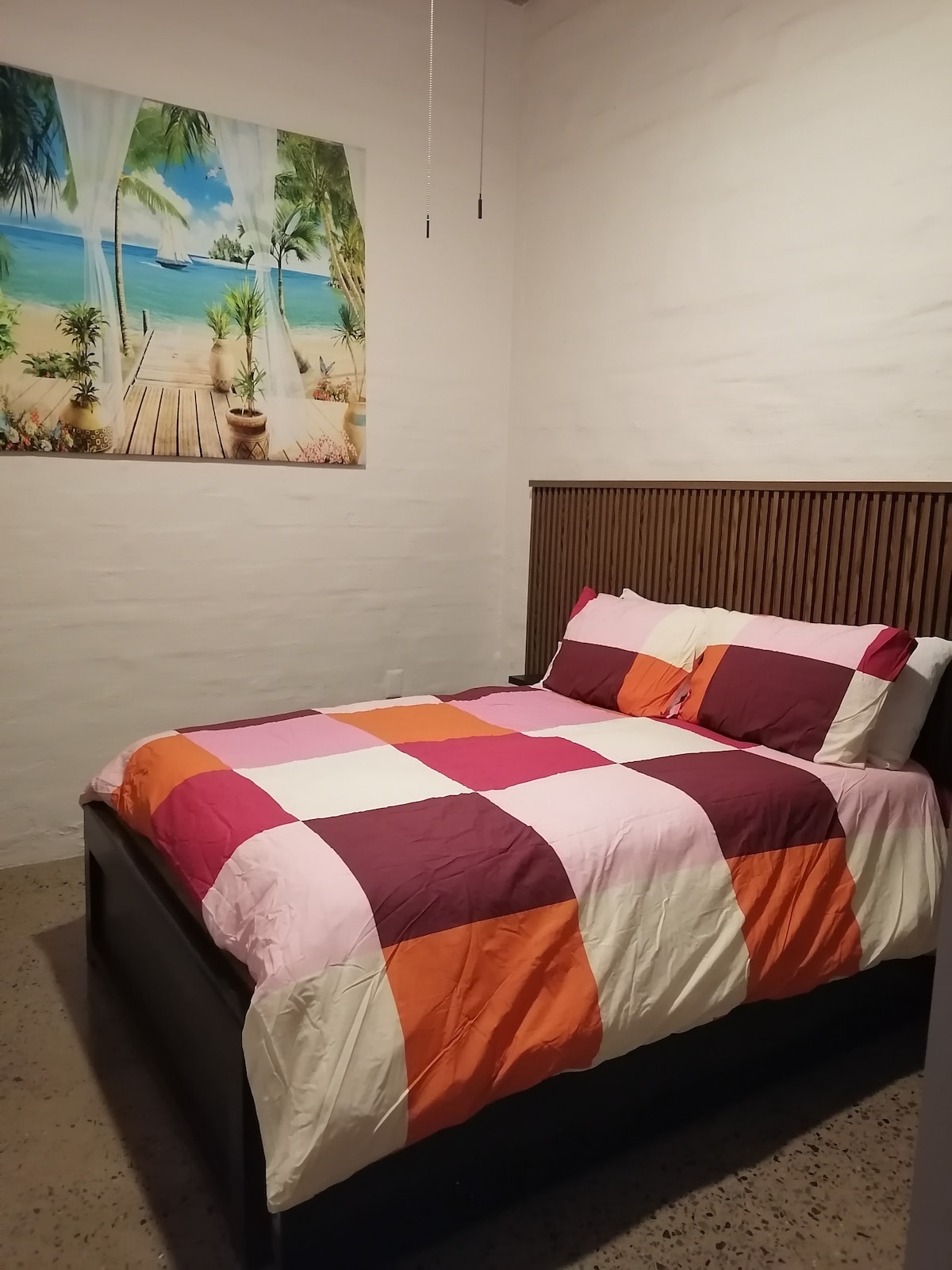 Tu familia estará cerca de todo si te hospedas en este alojamiento céntrico. Está diseñado para que descanses sin complicaciones. El ambiente es rústico-bohemio, con tonos neutros y detalles artesanales que lo hacen acogedor desde que entras. Lo que incluye: • Cama matrimonial + cama individual abatible • Baño de regadera y lavamanos con espejo • Clóset abierto • Toallas, jabón y shampoo • Ambiente tranquilo y seguro cerradura en la puerta de codigo