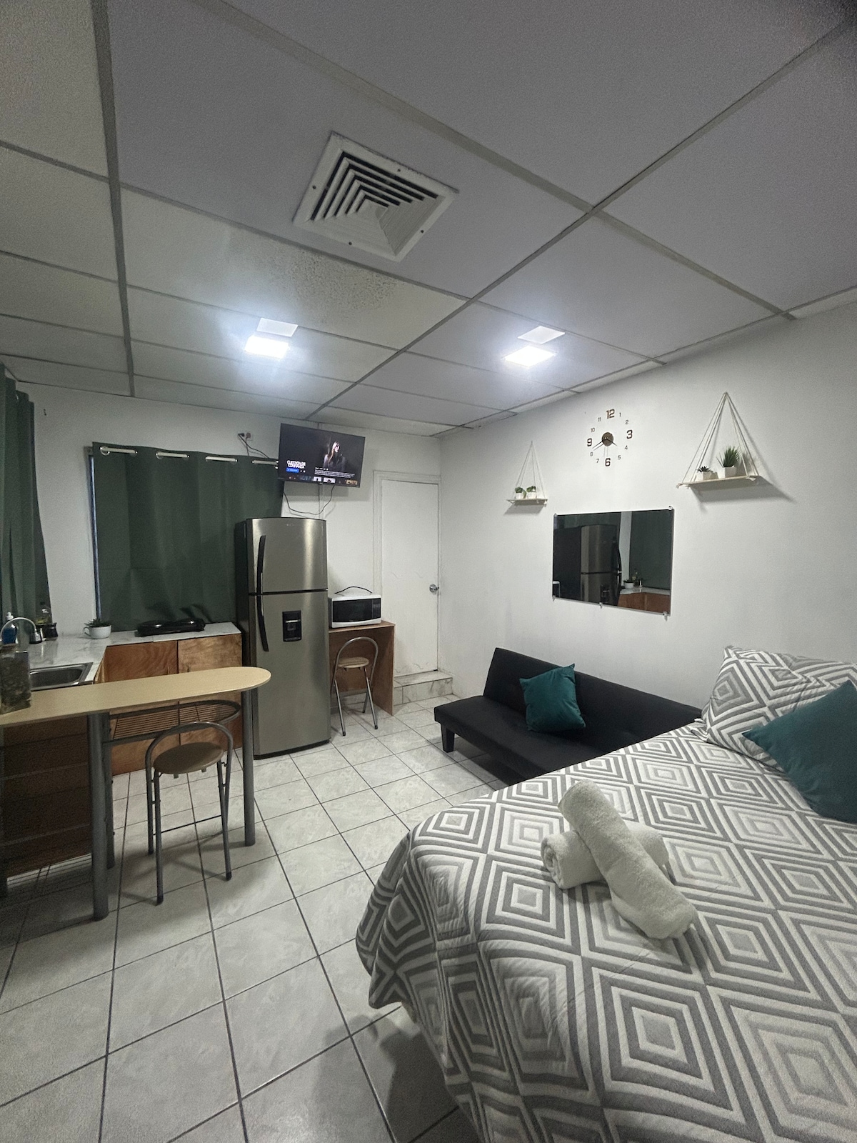 Moderno estudio en la ciudad de Santa Tecla, a corta distancia de playas (Surf City, El Sunzal), volcanes (El Boqueron), centros comerciales (Multiplaza, La Gran Vía, Plaza Merliot), Zona Rosa, San Benito, Centro Histórico de San Salvador y mucho mas. Equipado con todo lo que necesites para tus vacaciones o viaje de negocios. Para esos días en los que cocinar no este en tus planes, hay muchas opciones de comida a distancia caminable. Con parqueo privado, cocina, lavadora/secadora, internet y tv.