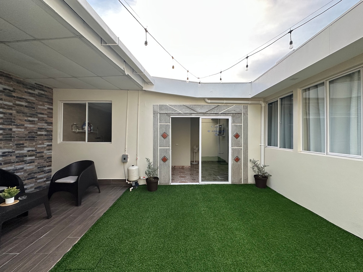 Cozy and discreet apartment located in a quiet and central residential area of San Salvador. The space is designed for 3 guests (max. 4) and equipped with everything you need for a comfortable stay: 1 bedroom with A/C and private bathroom with hot water Stable WiFi and TV with HDMI Fresh, well-ventilated terrace Private parking for 1 vehicle Self check-in with manual code lockbox. Just 5 minutes from Galerías Mall and 42 km from the International Airport.