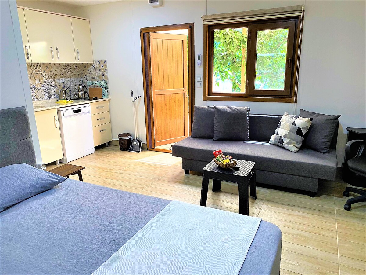 Only 50 meters away from the beach. Cozy house on the first floor with a green view in the trees Air conditioned bedroom with double bed + 1 living room with open kitchen and a triple sofa bed turns into a double bed when pulled out Open in all seasons. Hot water & blankets, duvets are available for winter time. Air condition is sufficient for heating. Electricity radiator heater can be also provided Wifi, Smart TV (satellite, Netflix), washing mach, dish washer, fridge, kitchen equipments
