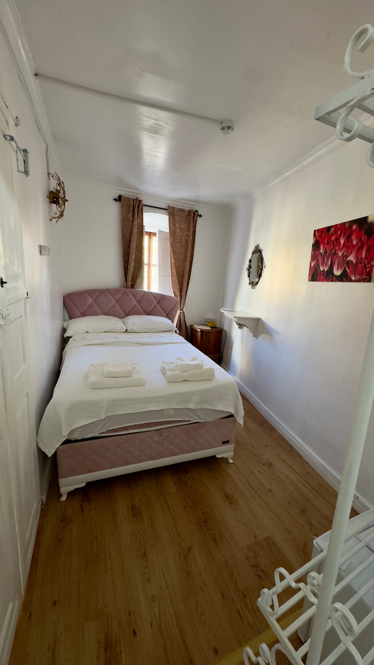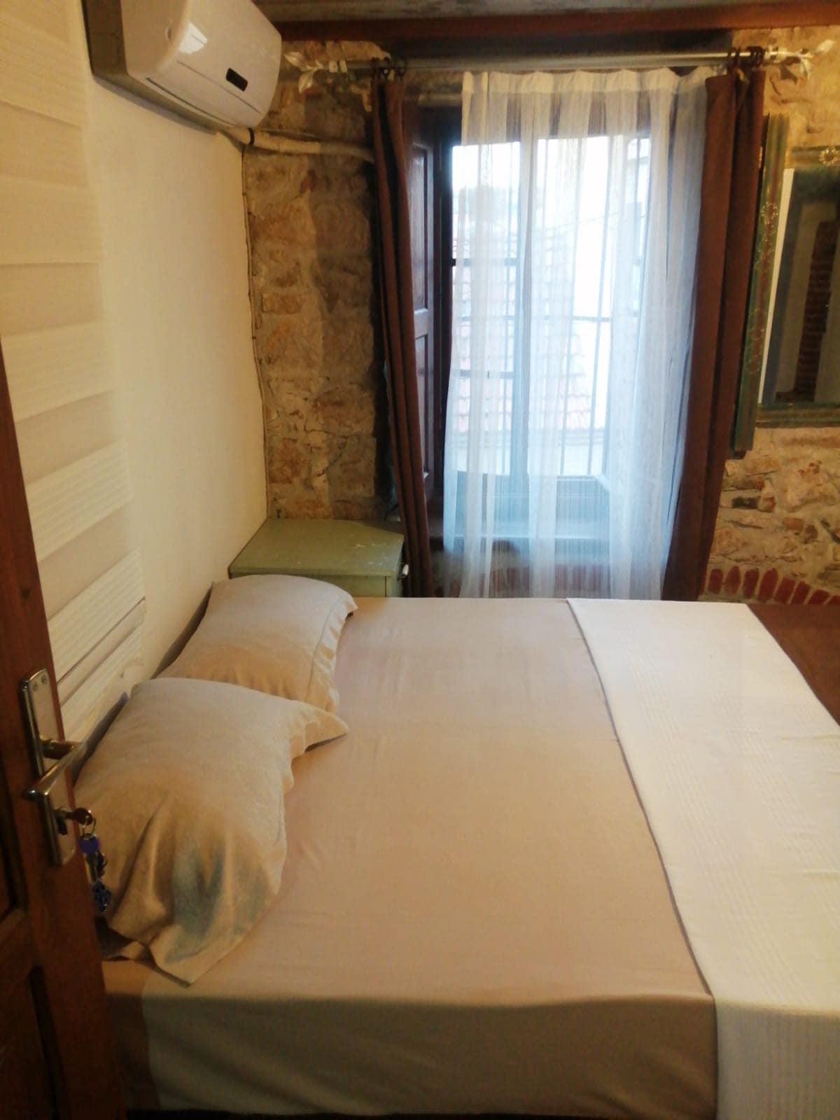 Çift kişilik ekonomik ufak odamız ile Ayvalık merkezde tarihi dokuyu yaşayın! Ufak odamızda 140 cm x 190 cm yatağa sahiptir. Ayrıca küçük de olsa tuvalet ve banyo odada mevcuttur. Oda 8 metrekaredir. 2.katta yer almaktadır. ( özellikle banyo ve oda küçüklüğünü belirtiyoruz) Fiyatlarımıza kahvaltı dahildir. *Görsellerdeki balkon oda dışında olup ortak kullanımlıdır.