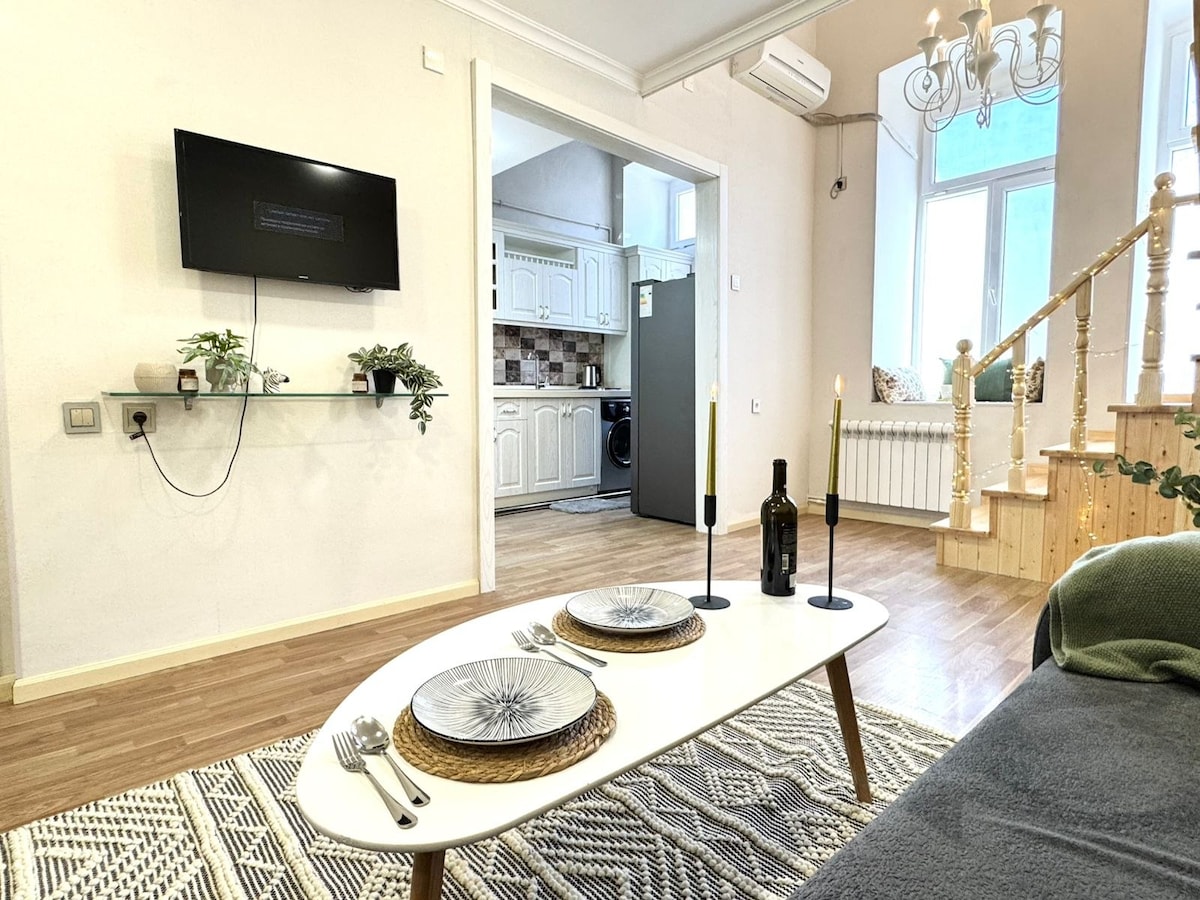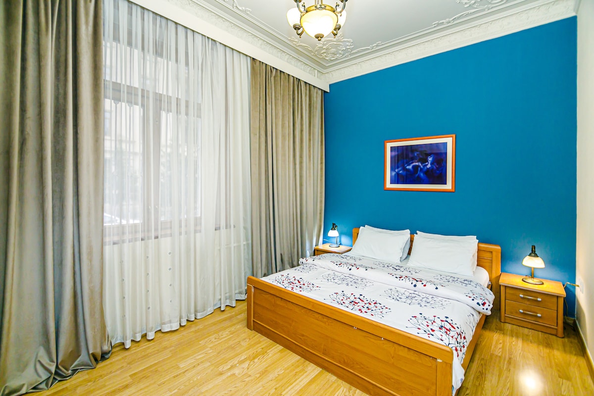 City Center Charm: Your Comfortable & Cozy Apartment Prepare to be captivated by the breathtaking view from the window, opening right to the iconic Nizami street, while being moments away from Boulevard (3 min) and Old City (5 min). Despite its central location, the flat cleverly faces the quiet part of the block, ensuring a peaceful and undisturbed sleep. In addition, we offer a high-speed Wi-Fi and air conditioning for your comfortable stay. The bathroom is small, consider before booking.