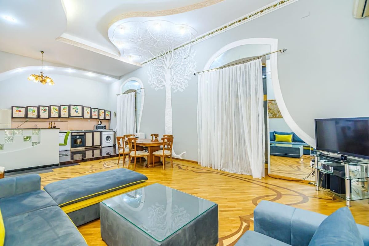 Panoramic 2BR apartment in the heart of Baku City Center located on Nizami Street, within walking distance to Old City (Icherisheher), the Maiden Tower, Winter Park, Seaside Boulevard, Fountains Square and Shirvanshahs’ Palace. Enjoy breathtaking city views of the Flame Towers and Təzə Pir Mosque from the apartment windows. The Formula 1 track is just 3 minutes’ walk from the apartment. • Airport transfer available upon request • 24/7 self check-in