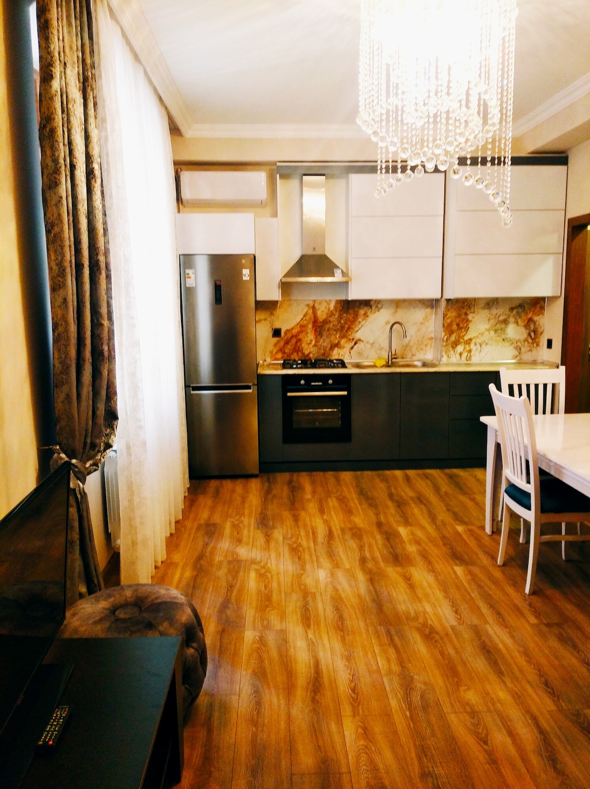 Super cosy apartment with a great view and remote working space area located on 19th floor of 20 story premium building. Only two dollars away from the city center with an uber while nearest metro station is 15 min away with walk. Brand new Gym and big supermarket in the area of residental complex and large playground designed for the families with kids. two large park nearby one of them is the biggest of the town. Great option for long term stays in a secure area with 24 hours cam surveillance.