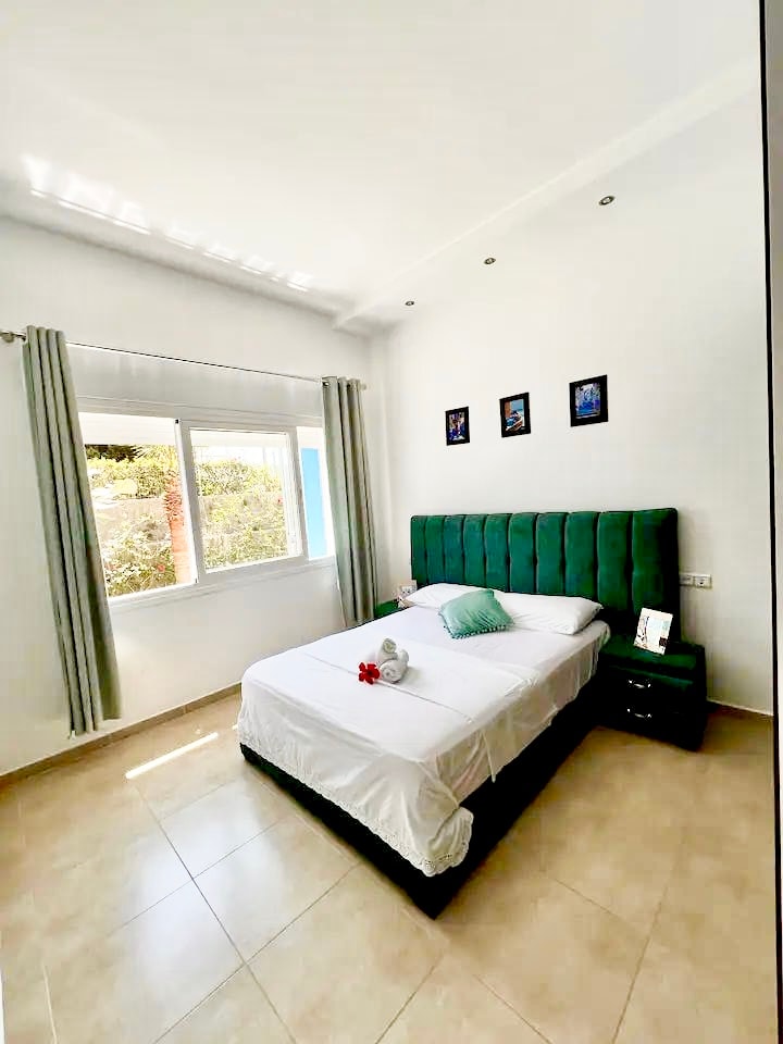 Villa de lujo con piscina grande privada auto-limpiante a 5 km de Cabo Negro y a 3 km del aeropuerto de Tétouan y McDonald’s. Con 2 habitaciones y 2 salones (uno con 4 sofás cama) para 8 adultos, cocina equipada, baños modernos, jardín con iluminación que se enciende al atardecer, zona de barbacoa y parking para 3 vehículos. Limpieza y mantenimiento garantizados. No se permiten fiestas , solo huéspedes respetuosos. Incluye climatizador automático