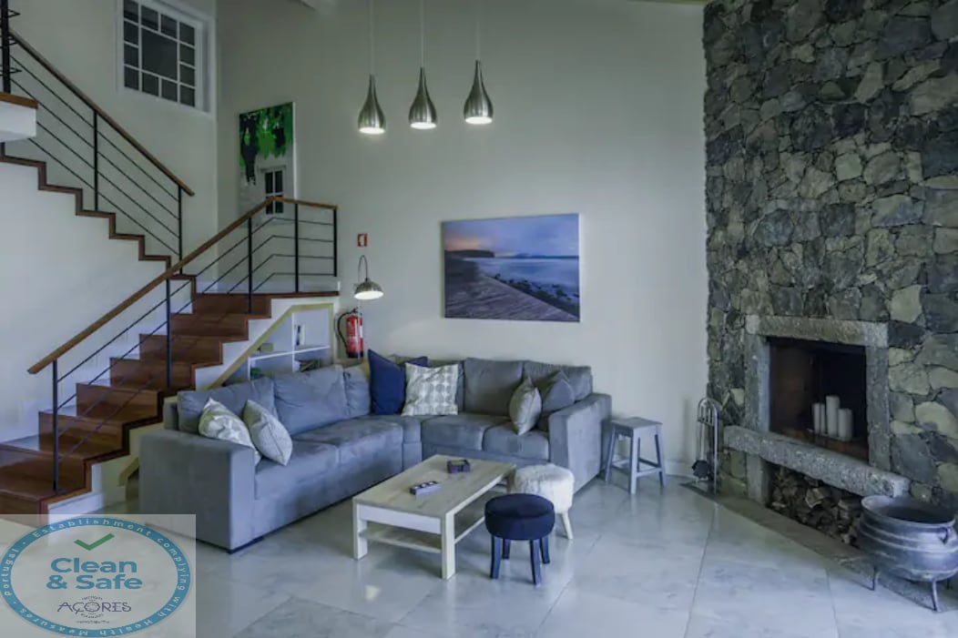 Welcome! To our fully renovated house. Conveniently located within walking distance to Santa Barbara beach, this 3 bedroom 2 bathroom rustic modern home brings the beauty of Sao Miguel's earth, sea and sky inside, featuring a tall volcanic rock fireplace, local wood beam ceilings, open concept kitchen with farmhouse sink and stainless steel appliances. Perfect for a large family or two families as sleeps 8-10 people comfortably. Reverse air conditioner through out the house.