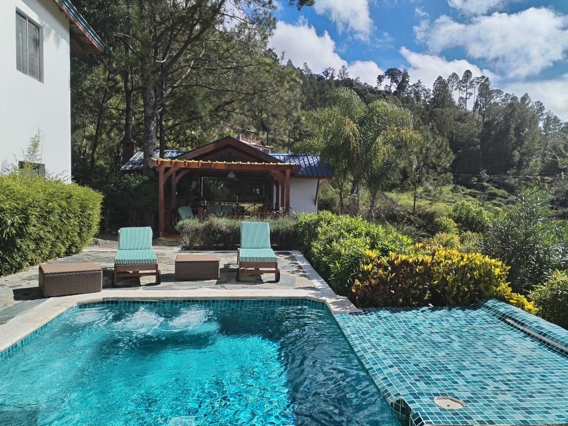 Acogedora cabaña en medio de los pinos y montañas de Arroyo Frío, Constanza; ideal para descansar, tomar aire fresco y alejarse del bullicio de la ciudad. La propiedad tiene capacidad para 16 personas y cuenta con espacio para estacionar 3 vehículos de los huéspedes. No necesita vehículo 4x4 para acceder. Tiene una terraza exterior con BBCUE y un hermoso patio lleno de pinos con una piscina desmontable !Relájate con toda la familia en este tranquilo lugar para quedarse!