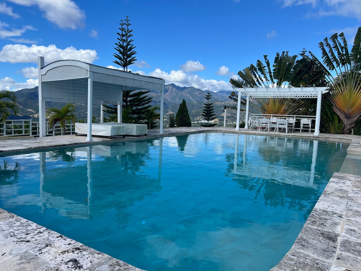 VACACIONES INOLVIDABLES..VILLA VIRGINIA TE ESPERA. Comparte la expresión de la naturaleza frente al espectacular paisaje de la Cordillera Central. Residencia campestre con sala-comedor, medio baño, cocina-desayunador, amplia terraza techada, JACUZZI CALIENTE🌡, terraza exterior, BBQ, casita de juegos, tres habitaciones: una con cama doble y baño privado; otra habitación con cama doble y camarote de cama doble y cama sencilla y baño privado y una tercera con cama doble, camarote y baño privado