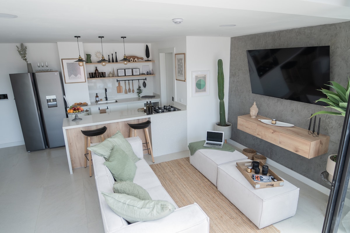 🌿 Your Home in Cuenca Modern 1-bedroom suite with boho Mediterranean style, ideal for families or couples. It features 2 bathrooms, a fully equipped kitchen, WiFi, TV, washer and dryer, plus access to a swimming pool, gym, and free parking, all within a private building. Located in a quiet and strategic area of Cuenca, close to restaurants, shopping centers, and the tram, and just 10 minutes from the Historic Center. Comfortable, elegant, and perfect for your stay.