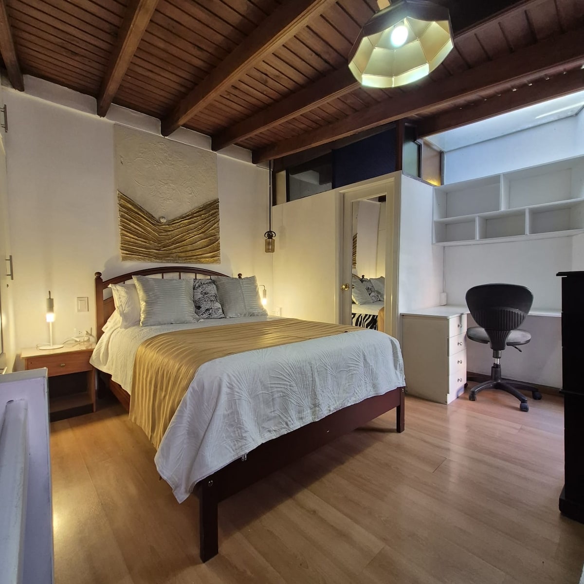 Disfruta de una experiencia con estilo en este alojamiento céntrico. El departamento está ubicado en la parte central de la ciudad en el segundo piso del edificio, se encuentra a pocos minutos de parques, bares, cines, mercado etc. El Espacio: La habitación es acogedora y tranquila con conexión gratis de wifi las 24 horas, con una elegante sala y con un cómodo sofácama. El departamento tiene acabados de primera con una excelente vista a laciudad.