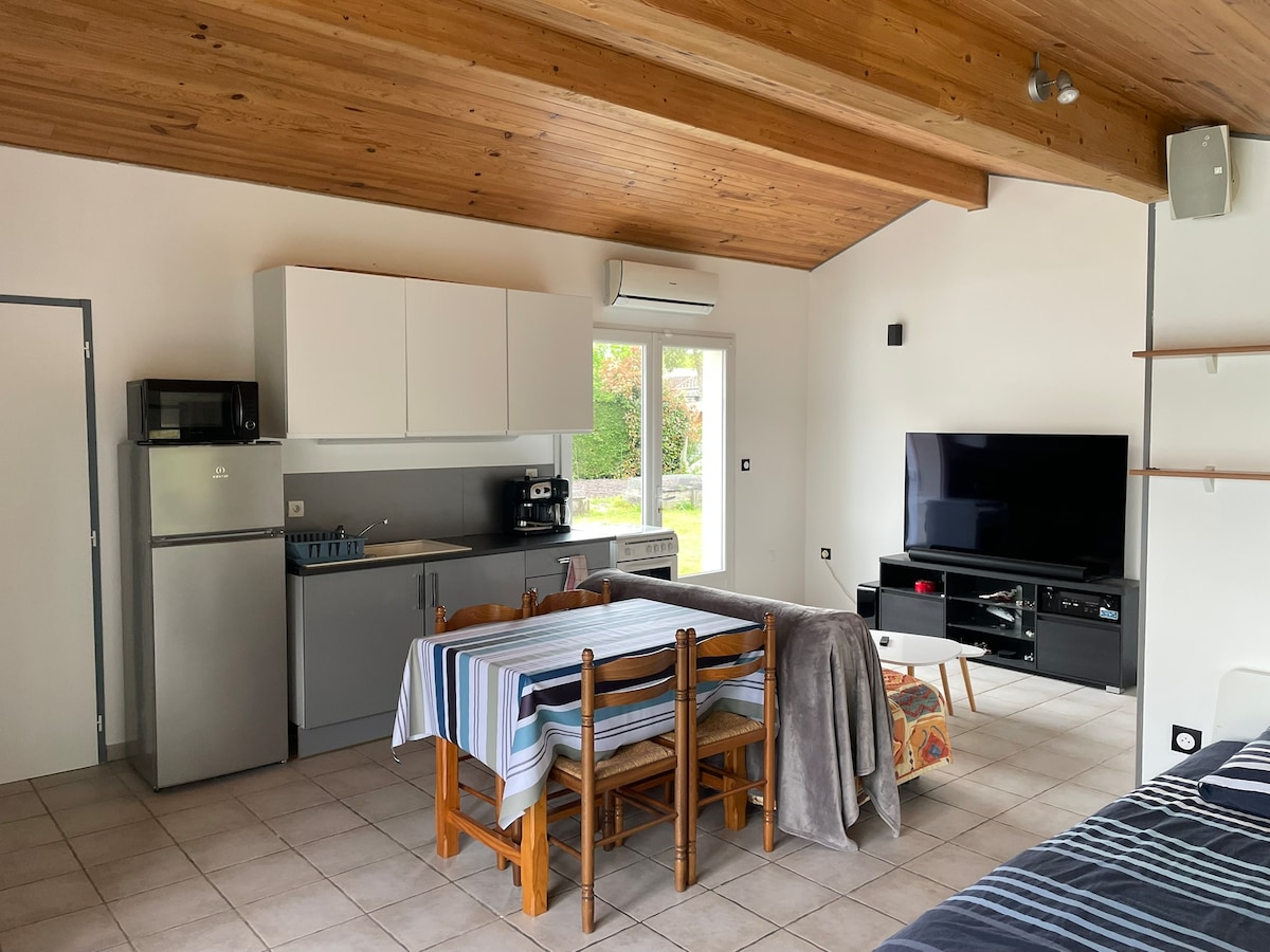 Dans une propriété verdoyante, charmant petit studio cocooning pour les adeptes de week end ou de vacances à la campagne en bord de mer. Indépendant de notre maison il est équipé entre autre d'un réfrigérateur, d'un lave linge, d'une machine à café, du WIFI et d'une banquette lit de 160cm. Nous vous fournirons également le linge de maison (draps, serviettes, torchons) ainsi que de 2 vélos qui sont à votre disposition. A très vite !!!