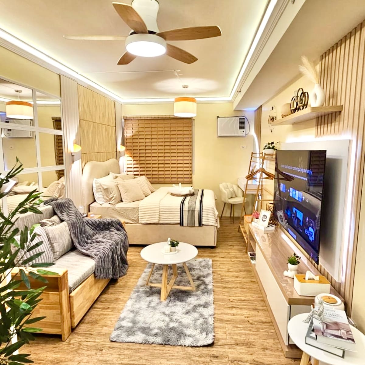 This place is a fusion of Japanese and Scandinavian design perfect for group of 6. It has 2br, 1 queen-sized bed, 1 convertible sofa bed, and a double deck. The living room has a 55-inch TV, board games like chess and Uno, and sungka. The fully-equipped kitchen provides home-like experience. It likewise has a bar table and a bar stool, and a balcony with a view of city lights. The condo unit has access to shared facilities (playground, pool, picnic area, paved jogging area), and sky lounge.