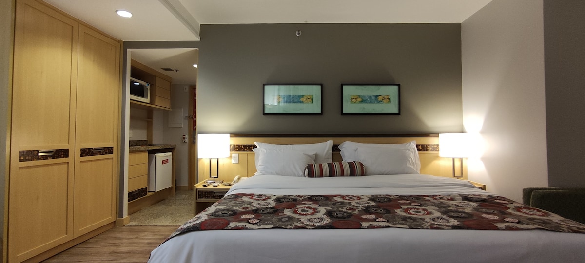 At the Cullinan Hplus Premium hotel. Very new and contemporary. Amazing location! Two malls across the street. Great tourist spots to go on foot. Charming, finely decorated and furnished unit. On the highest floor, with a beautiful view of Brasília and Asa Norte. 29m² luxury suite with king bed. Well equipped with several items for your convenience. Acoustic insulation on the windows for a great rest. Smart TV. Garage. Swimming pool, gym, sauna and restaurant. Check in 24 hours at reception.