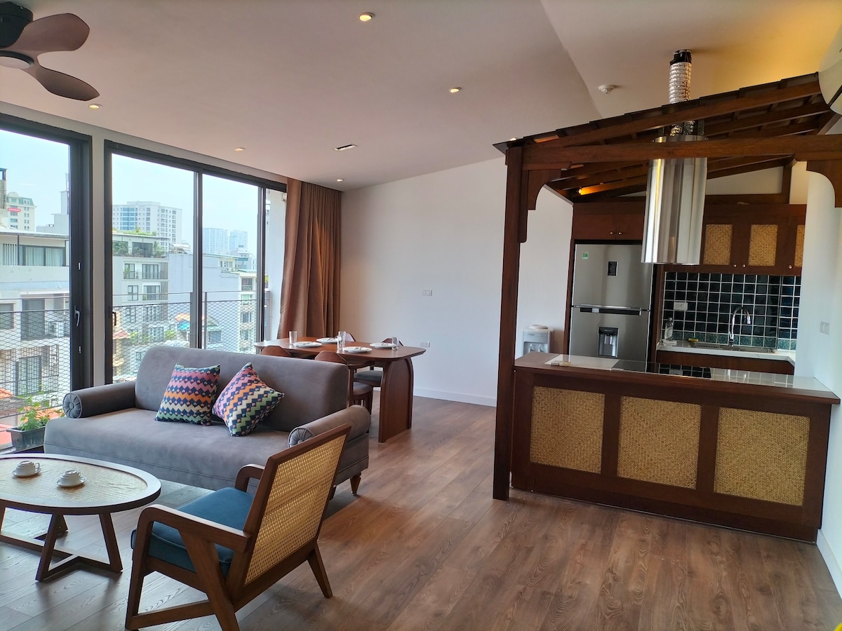 The apartment just opened in June 2025. It is meticulously designed in a mid-century style blended with Vietnamese cultural elements. Most importantly, it’s located right in Hoan Kiem District—just a 5-minute walk to the famous Train Street coffee check-in spot and another 5 minutes to Hanoi’s Old Quarter. Enjoy a stylish experience at this centrally-located place.