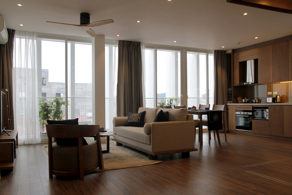 Căn hộ bao gồm 1 phòng ngủ sáng sủa với giường King size, phòng tắm khép kín có bồn tắm, khăn tắm và bàn chải đánh răng, sữa tắm, dầu gội. Phòng khách rộng rãi, có cửa sổ lớn với sofa, bàn trà, tivi 43 inch với hơn 50 kênh quốc tế. Nước Lavie sẽ được cung cấp hàng ngày trong các chai lớn có máy lọc nước. Nhà bếp cực kỳ tiện nghi với tất cả các bếp hiện đại, tủ lạnh lớn và bộ bàn ăn. Chúng tôi mong muốn mang đến sự tiện nghi, yên tĩnh cho bạn trong khoảng thời gian ghé thăm Hà Nội xinh đẹp.