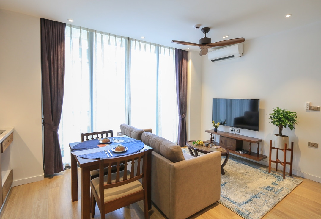 Welcome to Tropical house! Just a few steps away from the Old Quarter, crossing the serene ground hall a harmony of wooden frames, greens, swimming koi, and up to this spacious, elegant 1 bedroom, 1 bathroom serviced apartment well illuminated by daylight through the glass wall. The standard styling of the apartment brings in dark wood, understated styling furniture, featuring panels of rattan in natural colors creates calm, eye soothing feelings