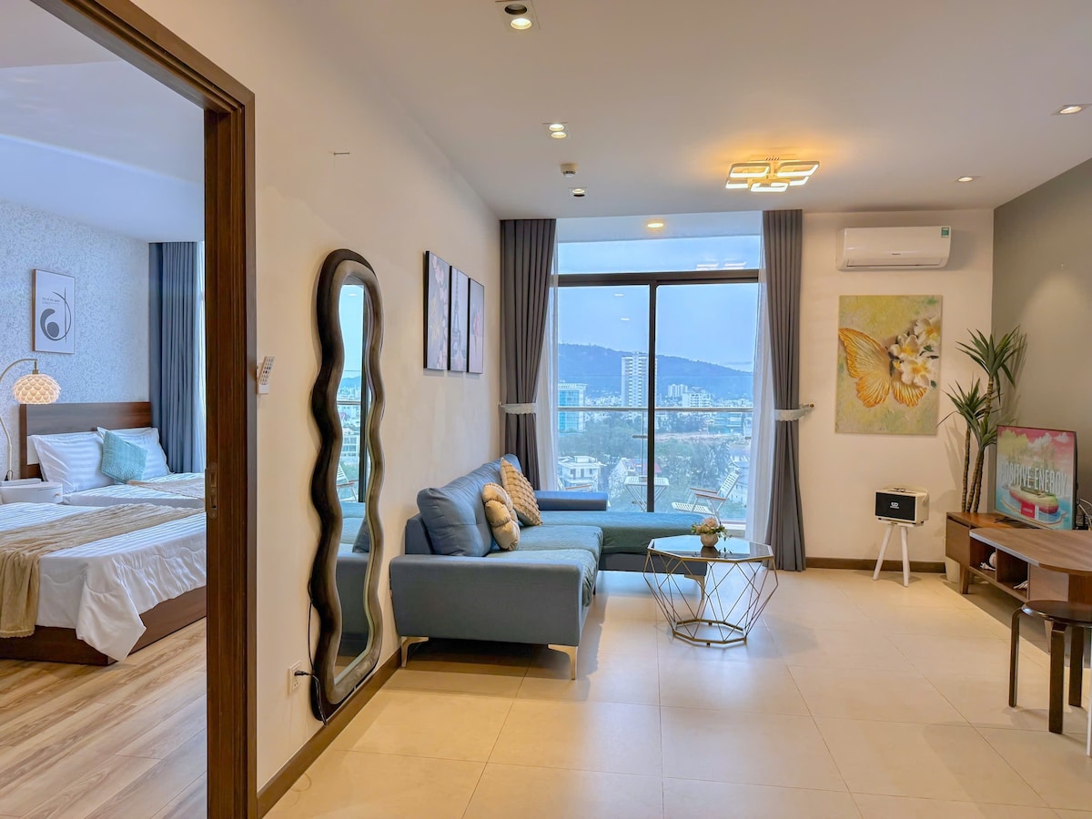 Our apartment has 1 living room, dining space, 1 bedroom (1 double bed and sofa bed), 1 bathroom and the balcony. - The bedroom: Our view from the bedroom is romantic with the view of the grand hill shimmering. We provide air-conditioner, the bed topper, and the bolster. - Kitchen: necessary facilities is provided to cook a delicious meal. - Balcony: spacious balcony with a set of 2 cane-chairs vs 1 table, where guests relax and enjoy the stunning views of the blue sea with a delicious meal.