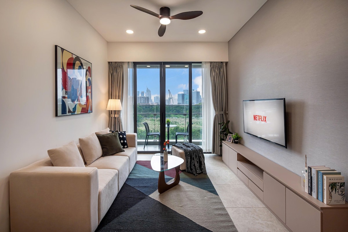 A stylish & comfortable apartment 85m2 at Hung Phuc Happy Residence Premier located in the heart of district 7, Phu My Hung, with just a short walk to all the best shops, restaurants, and conveniences. Nearest bus stop in front. Highly educated and quite neighbors that surrounded by green parks and beautiful villas. Decorated in modern Japandi x Wabi sabi style with a focus on natural materials & clean lines. A great getaway or even staycation for those who want to experience new things.
