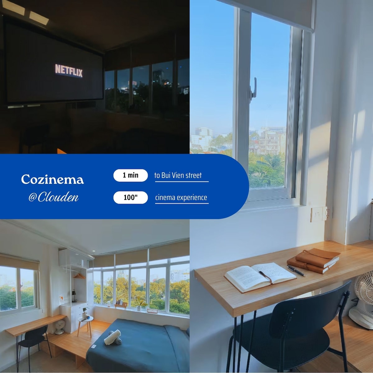 Kanso @ Cozinema offers three unbeatable features: 1. Prime Location: Heart of HCMC, 1 min to Bui Vien Street and 5 mins to Ben Thanh Market. Surrounded by cafés, local eats, and public transports right at your doorstep. 2. Skyline & Parkfront Views: Enjoy a breezy balcony overlooking 23/9 Park, blending lush greenery with stunning city skyline lights at night - the perfect balance of calm and vibrant. 3. Cinematic Retreat: 100" 4K projector & Dolby 5.1 audio for ultimate relaxation.
