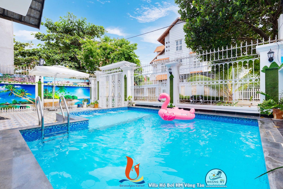Villa có tổng diện tích 500 mét vuông cách bãi tắm 100 mét 6pn 10 giường 7wc gồm 1 trệt 1 lầu , phòng khách và phòng ngủ đều có máy lạnh . Ngoài ra villa chuẩn bị 5 nệm thêm chăn mền đủ cho đoàn 30 khách . Hồ bơi 100 mét vuông Sân vườn tổ chức 6 bàn tiệc ngoài ra trong nhà tổ chức 30 người ngồi thoải mái . Những thứ có sẵn tại villa khách sử dụng free: Karaoke Loa kéo , bàn bida , than nướng bbq, Sub chèo thuyền hồ bơi, áo phao bơi cho các em bé. Đậu xe trước cổng nhà.