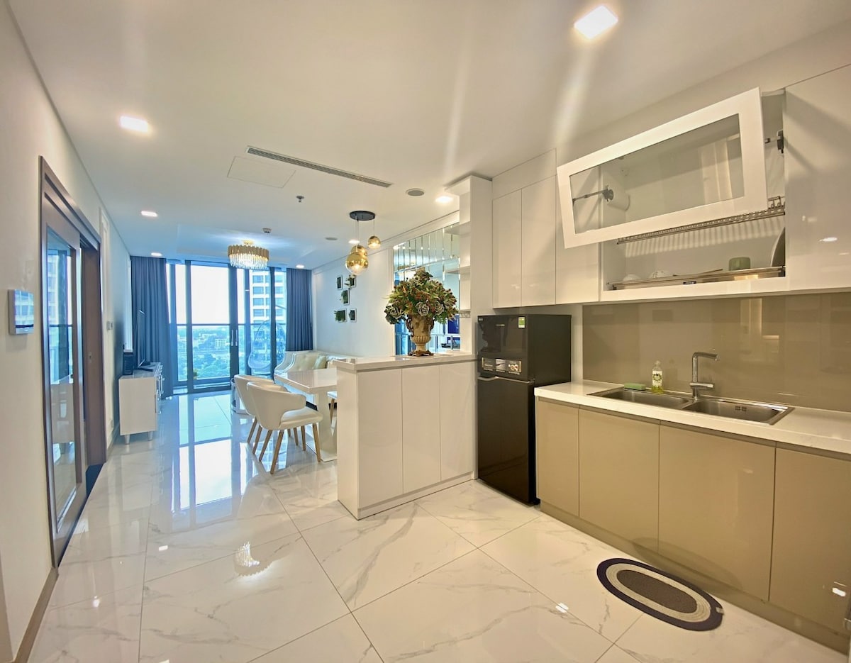 Căn hộ 1pn nằm trong tòa Landmark 81 có đầy đủ nội thất sang xịn: máy sấy tóc, bàn ủi, máy giặt, vật dụng bếp chén bát, bếp điện,... - 1 bedroom apartment located in Landmark 81 building with full luxury furniture: hair dryer, iron, washing machine, kitchen utensils, electric stove,...