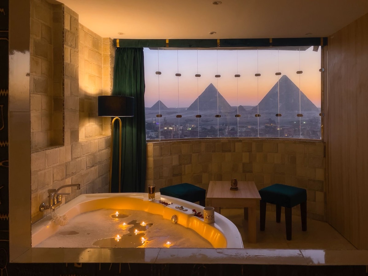 Enjoy your jacuzzi with the best pyramids view a wonderful breakfast with our stunning view of the three pyramids and sphinx. Please note that Arab and Egyptian citizens are required to submit proof of marriage before check in. The room is located on our 2th floor and is one of newly refurbished rooms. Guests will enjoy staying in beautifully designed, Egyptian themed room with a Pyramids View!