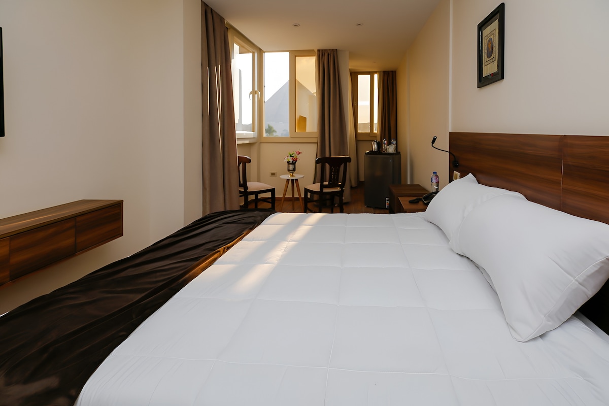 Enjoy a private room featuring a large, comfortable bed and a stunning panoramic view of the Giza Pyramids. Our friendly five-star service is available 24/7 to ensure a relaxing, seamless, and memorable stay.