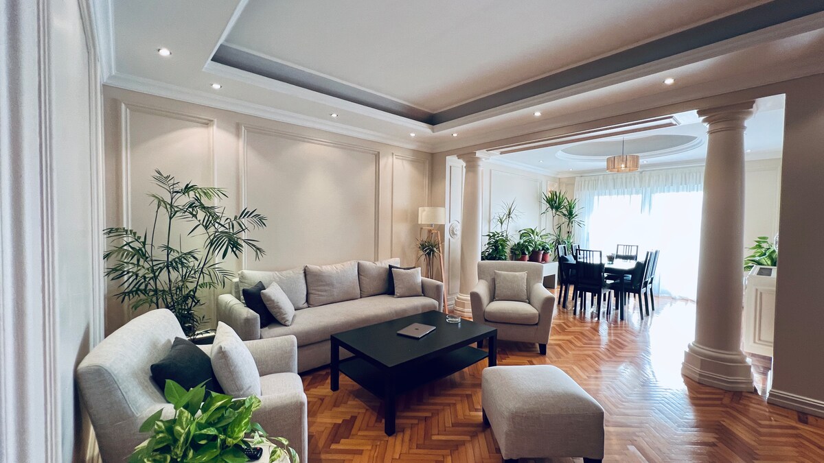Located in the Sakakini historical building! Nested in the heart of Cairo, places you just steps away from vibrant markets, trendy cafés, and some of the city’s most iconic landmarks. 🏛️ 5' minutes to the Egyptian Museum/ Tahrir square 🚇 5' minutes walk to Metro Station ✈️20' minutes to New Cairo/ Airport 🛕20' minutes to the Pyramids Natural light streaming through 3 large, sunny panoramic balconies and 7 panoramic colored windows.