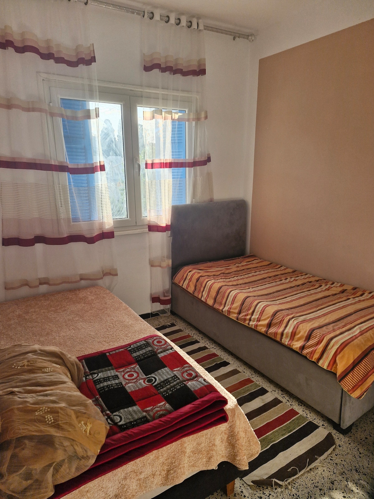Bienvenue chez vous. Cet appartement lumineux au 3 étage avec une magnifique vue, décoré avec des pièces artisanales tunisiennes et des touches bohème chic. Vous profiterez d’un salon ensoleillé, de deux chambres cosy, d’une cuisine conviviale, d’une belle salle d’eau rénovée et d’un petit balcon où l’on respire la Méditerranée. Chaque détail a été choisi avec soin pour créer une ambiance authentique, apaisante et chaleureuse, idéale pour se reposer, travailler ou explorer la région.