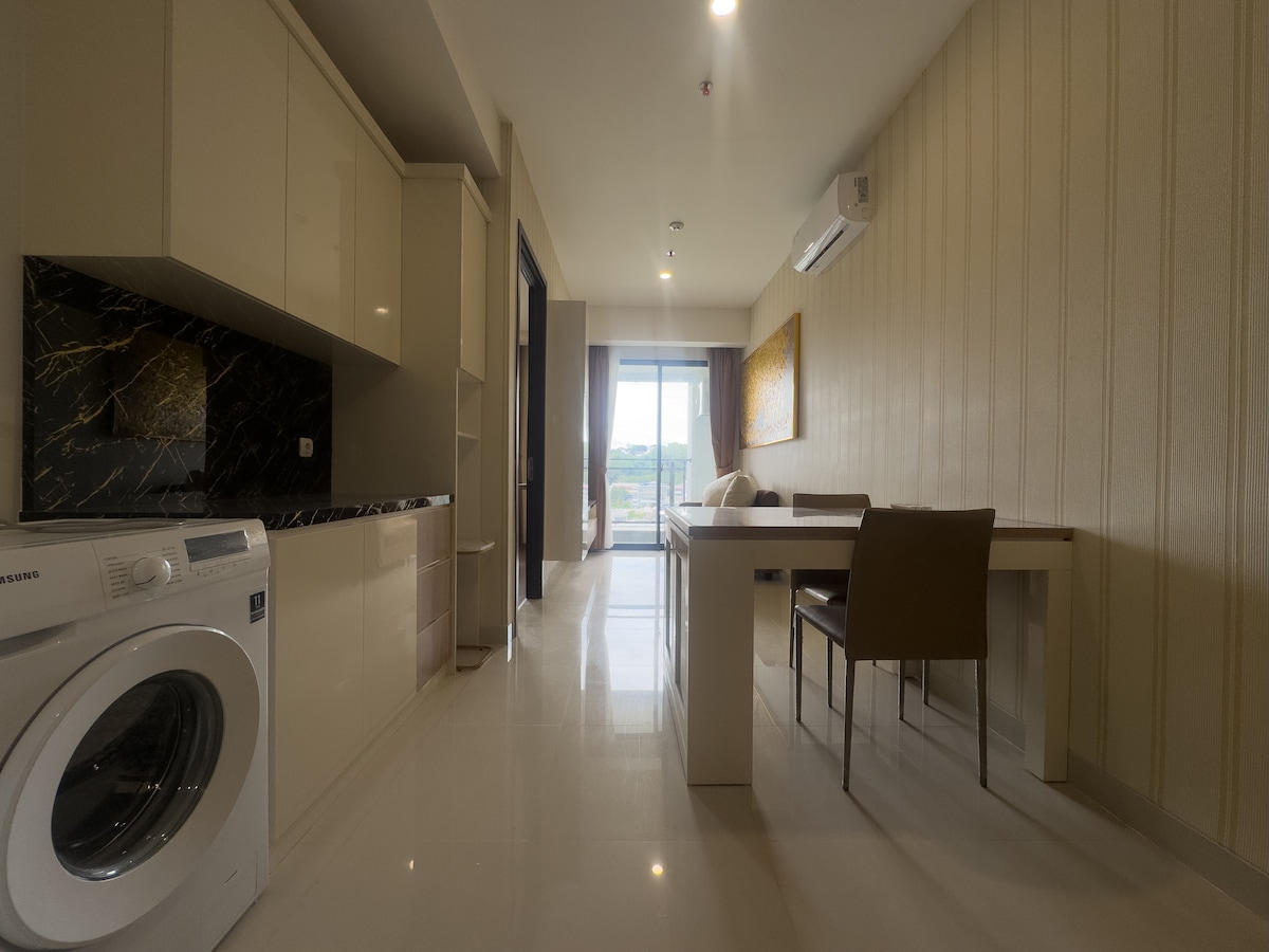 A brand new and simple but comfy studio apartment located in a 4 star hotel compound. Pool and Gym, hotel facilities are free to use. 24hrs Circle K is just across the street. Restaurants, Laundry and other shops are just a walking distance. Direct Bus Service to Jakarta's Soekarno Hatta's International Airport is just at the entrance of the Hotel with a budget friendly rate and comfortable seats.(Rp.55K/pax as Oct 1,2019) Overall staying at our place is strategic and full of basic facilities.