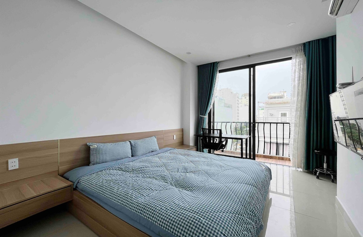 Experience Da Nang from above in this bright and elegant 4th floor studio. Enjoy wide city views from your private balcony and plenty of natural light from large windows. The space feels open and peaceful, blending minimalist design with cozy comfort. A spacious workstation with a comfortable chair sits by the window, giving you a calm and inspiring place to read, work, or simply enjoy the breeze. Perfect for travelers seeking calm, modern living close to the city’s energy.