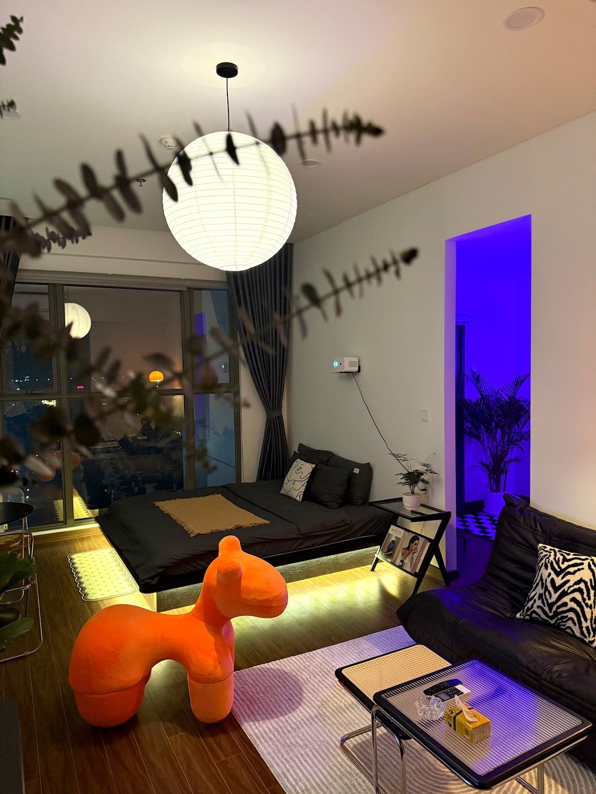 Căn phòng ngập tràn lãng mạn, tận hưởng netflix & chill Với thiết kế lấy tone trắng đen làm chủ đạo, decor thanh nhẹ với phong cách art châu Âu, cùng sắc đèn vàng ấm cúng, ban công hướng ra ngoài thành phố, máy chiếu có Netflix để chill buổi đêm, khu bếp nhỏ để tự nấu những món ăn thật ngon cho bản thân,...chắc chắn sẽ giúp bạn có những trải nghiệm chữa lành tâm hồn thật đặc biệt.