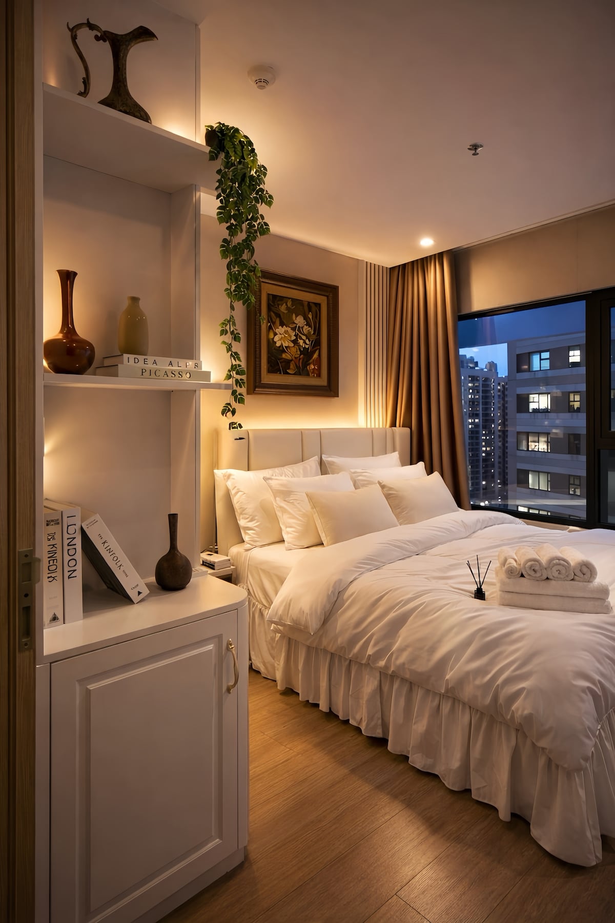🌆 Experience a luxurious yet cozy living space right in the heart of the city. ✨ The apartment features a modern minimalist design, with a comfortable hotel-style bed, fresh linens. 🪟 Enjoy a beautiful, open view of VinUni, especially relaxing during the afternoon and at night. 🛋️ Perfect for: vacations, business trips, or couples looking for a private and comfortable stay. 📍 Convenient location, near Pearl Lake with easy access to central areas. 💯 Guaranteed: clean – quiet - private