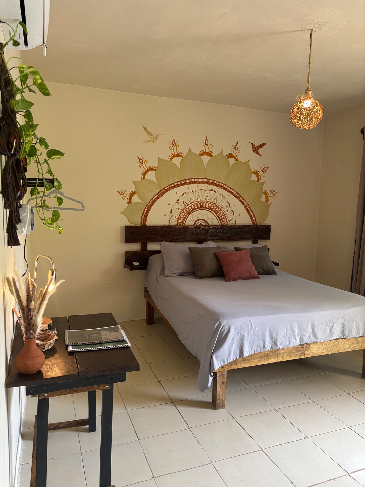 Hermoso cuarto confortable con todos los servicios necesarios para una calida estancia. Cuenta con una cama King Size, 1 cama individual, A/A, Ventiladores de Techo, Smart TV con Netflix, HBO, Prime Video), Frigobar, Cafetera con café de grano, WIFI), Baño propio. Laguna a solo 3 cuadras, mercado a 1 cuadra, centro a 3 cuadras. Contamos con 3 bicicletas incluidas en el precio de la habitación y cocina completa compartida.