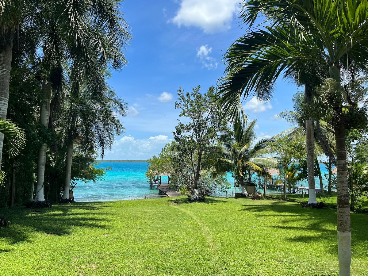 Hermosa casa ubicada sobre la costera a tan solo 3 Km del pueblo de Bacalar. Con 4 cuartos, dos dentro de la casa y dos bungalows independientes en la parte posterior; Integración y privacidad. Todos con baño y a/a. Estacionamiento privado, rampa y muelle. La alberca con vista a la laguna se encuentra a un lado de la terraza lo que te permitirá descansar y convivir con familiares y amigos sin tener que salir del agua. Totalmente equipada para que tu estancia sea inolvidable.