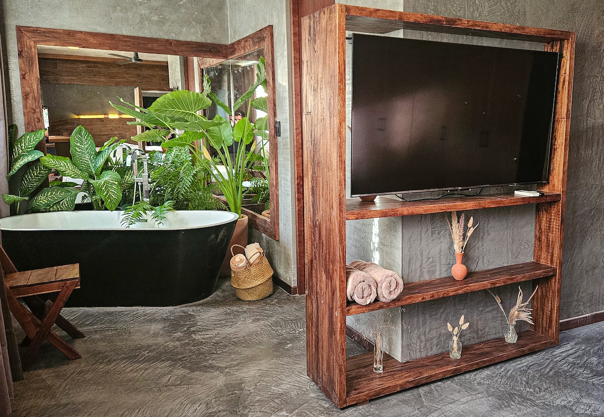 Welcome to your peaceful escape Relax in a bright, stylish apartment with a private garden and splash pool. Start your day with coffee from the cappuccino maker and breakfast with the toaster or panini maker. Explore the lagoon with the inflatable kayak via a private dock. Work with ease using the desk, monitor, and speakers, or unwind with the 65" Smart TV. Whether you're here for rest or remote work, we've designed this space to give you the perfect balance of comfort & connection to nature