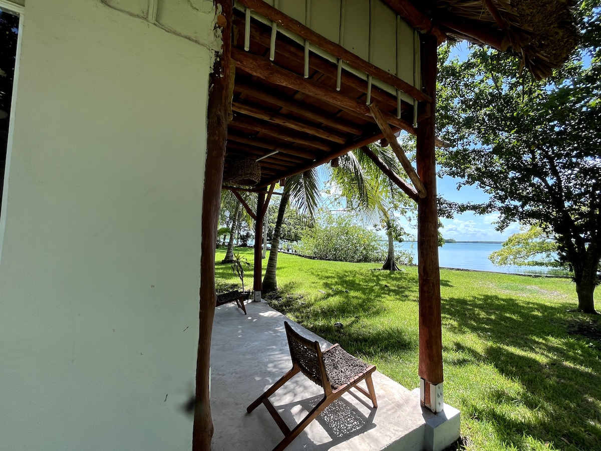 esta Casa Belizeña cuenta con 2 habitciones 1 cama king otra con 2 camas matrimoniales y una cama king size en la sala cocina completa equipada estufa ustencilos para cocinar refrigerador con 1 cerveza 1 coca y 1 cafe que se repone diario A/C tv pantalla netflix ventilador closet baño privado shampo jabon de cuerpo acondicionador ... terraza con vista a la laguna incluye paddel kayak de uso gratuiito tambien hemoso jardin y muelle con palapas el el agua 1 verdadero paraiso bienvenidos.
