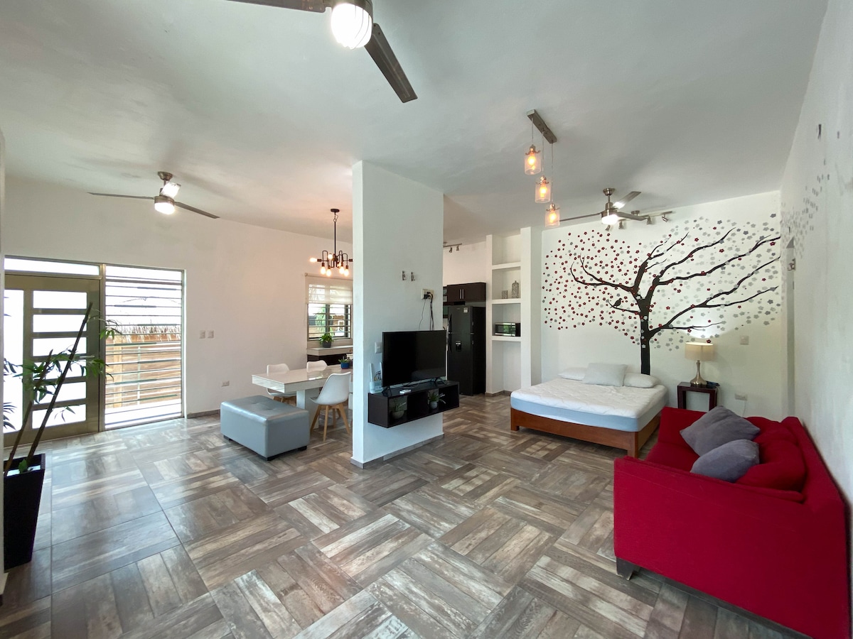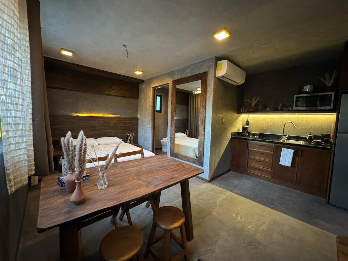 The ground floor studio apartment at Hotel & Suites Oasis Bacalar is very practical, cozy and charming. - A spacious, open floor plan. - A Queen bed. - A fully equipped kitchen. - Full size fridge, mircowave, blender, toaster, pots/pans and various kitchen equipment. - A hardwood dining table. - An indoor sitting area with a sofa and coffee table. - A private outdoor area with chairs and table. - A second outdoor sitting area with view to the pool. - Fast wifi - Tv with Roku. - Prime location!