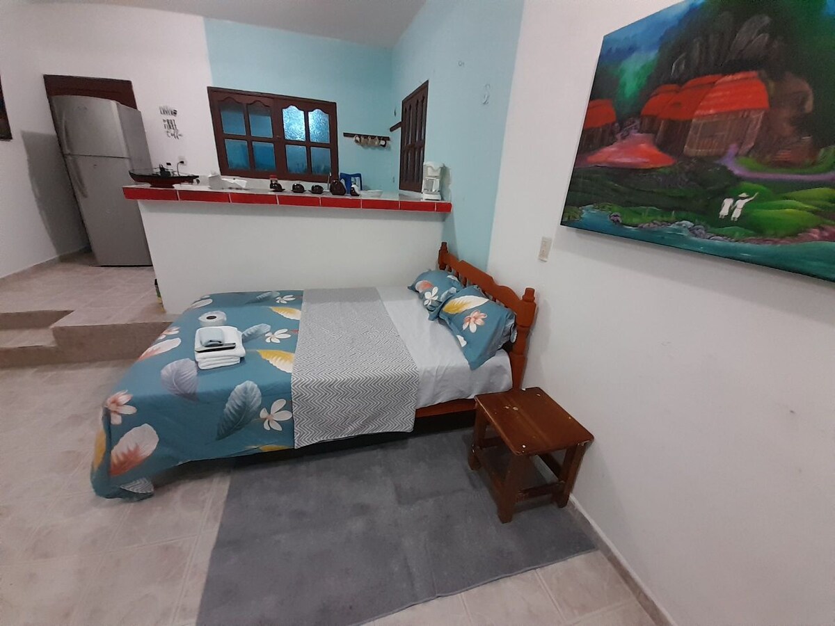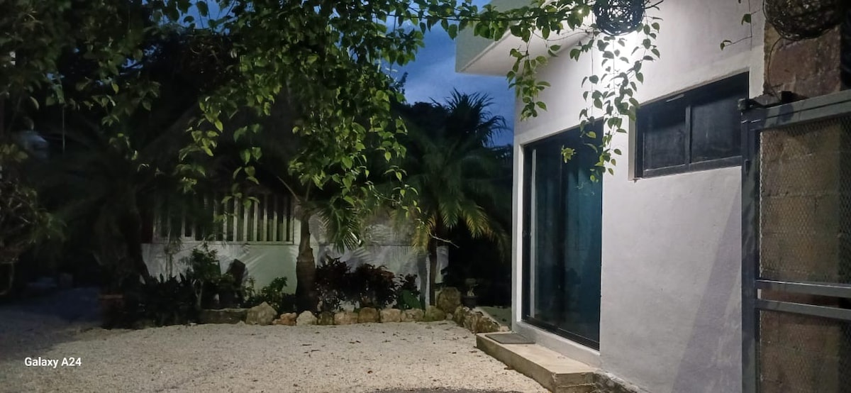 Departamento con entrada independiente dentro de una casa de campo, rodeada de árboles y animales de campo (gallinas y 4 perros). La habitación cuenta con una cama king size, hamaca, baño privado, TV con Roku, AA, internet y cocina propia con estufa, cafetera, refrigerador, licuadora y trastes. El espacio se encuentra a pocos metros de la laguna y de la terminal de autobuses (ADO). La propiedad es completamente segura y cuenta con un área amplia de jardín y estacionamiento.