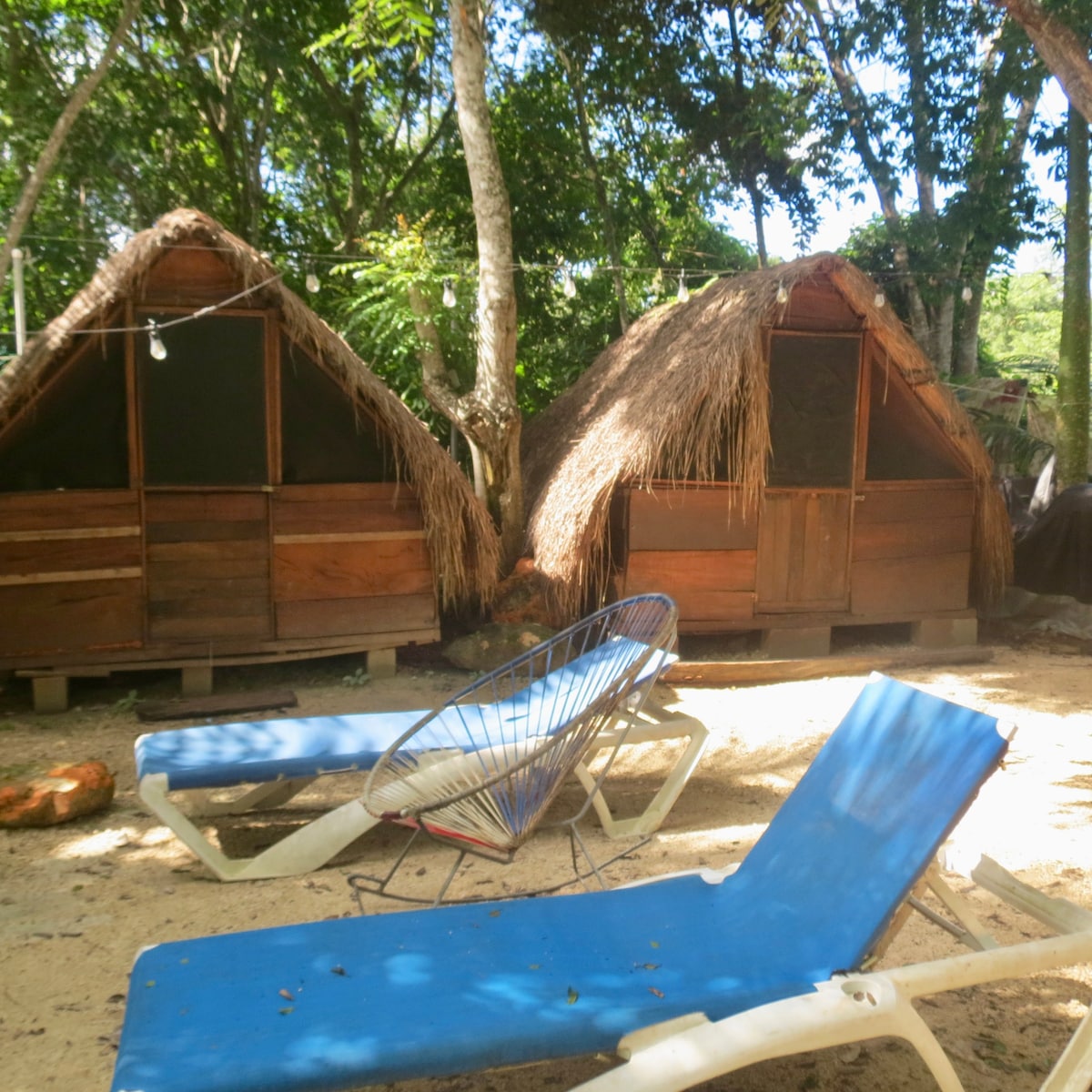 Comoda, fresca y bastante grande habitación de madera tipo cabaña con pequeño porche y hermosa vista a la laguna y al jardin. Con cama matrimonial para 2 personas. Con electricidad y wifi en el área de cabaña. Cuenta con espacio para 2 hamacas por lo que es posible hospedar a 1 persona mas. Pequeña mesa tipo escritorio y frigobar. 1 bici plegable disponible. Baño completo compartido con otra más pequeña cabaña. Jardin, palapa de usos múltiples, muelle y kayaks. Acceso directo a la laguna.