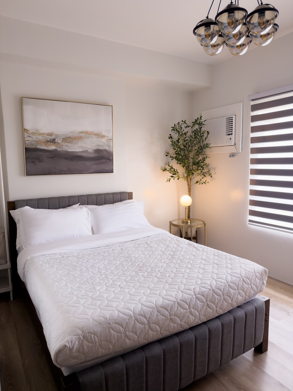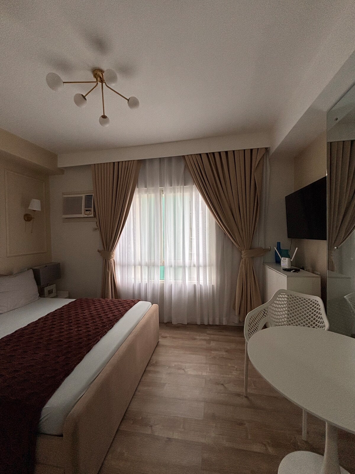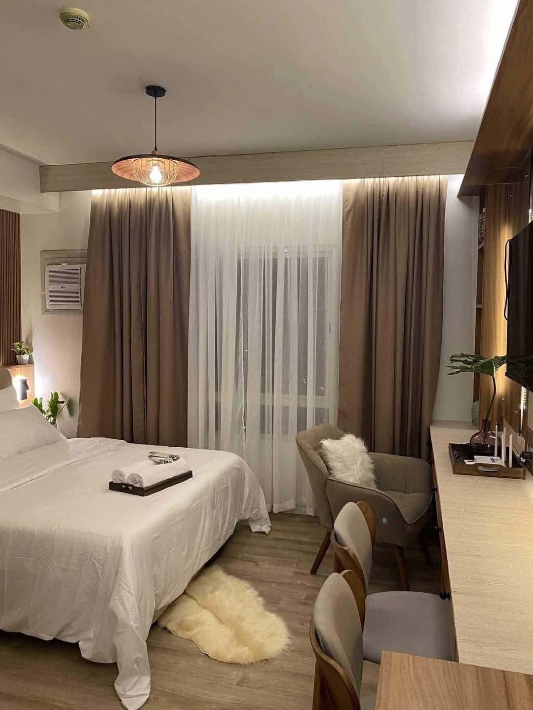 Perched on the 16th floor, this cozy studio offers sweeping views of Bacolod’s skyline and sea. Wake to golden light streaming through the window, unwind under a chandelier of stars, and rest in soft linens. A warm wood desk invites work or journaling. Perfect for solo travelers or couples seeking serenity above the city—compact, calm, and unforgettable.